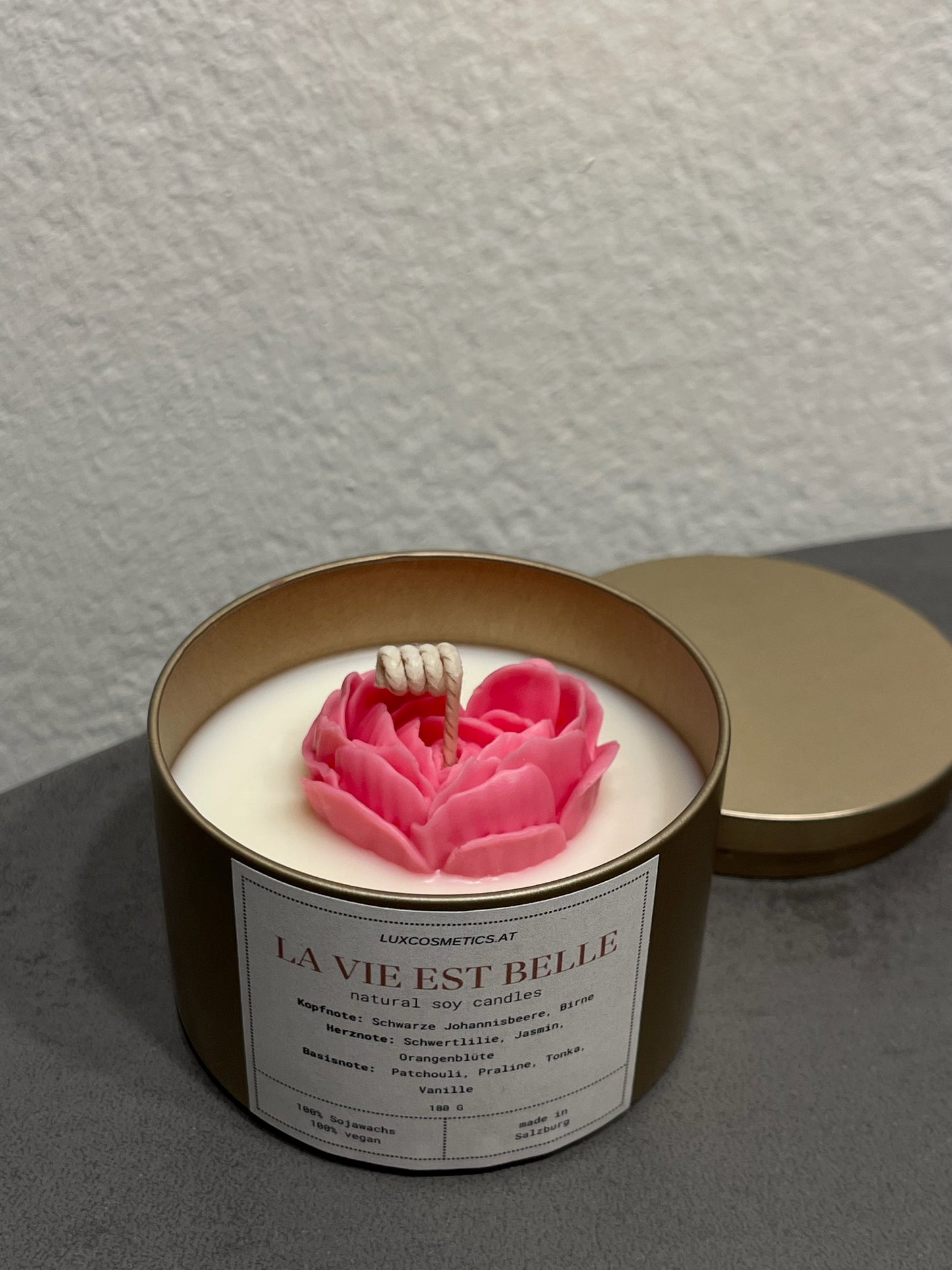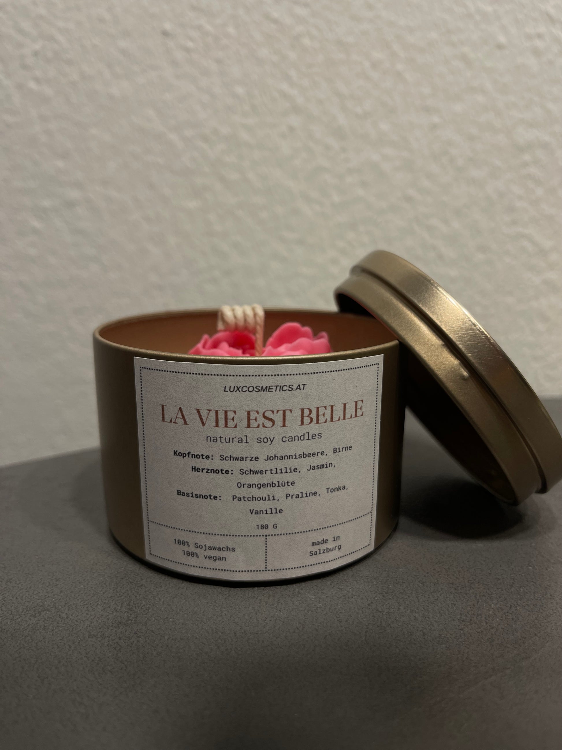 Lasse dich verzaubern von unserer handgefertigten la vie est belle Duftkerze aus natürlichem Sojawachs! Unser Sojawachs ist umweltfreundlich, rußt kaum und ist biologisch abbaubar – perfekt für alle, die auf Nachhaltigkeit setzen.
