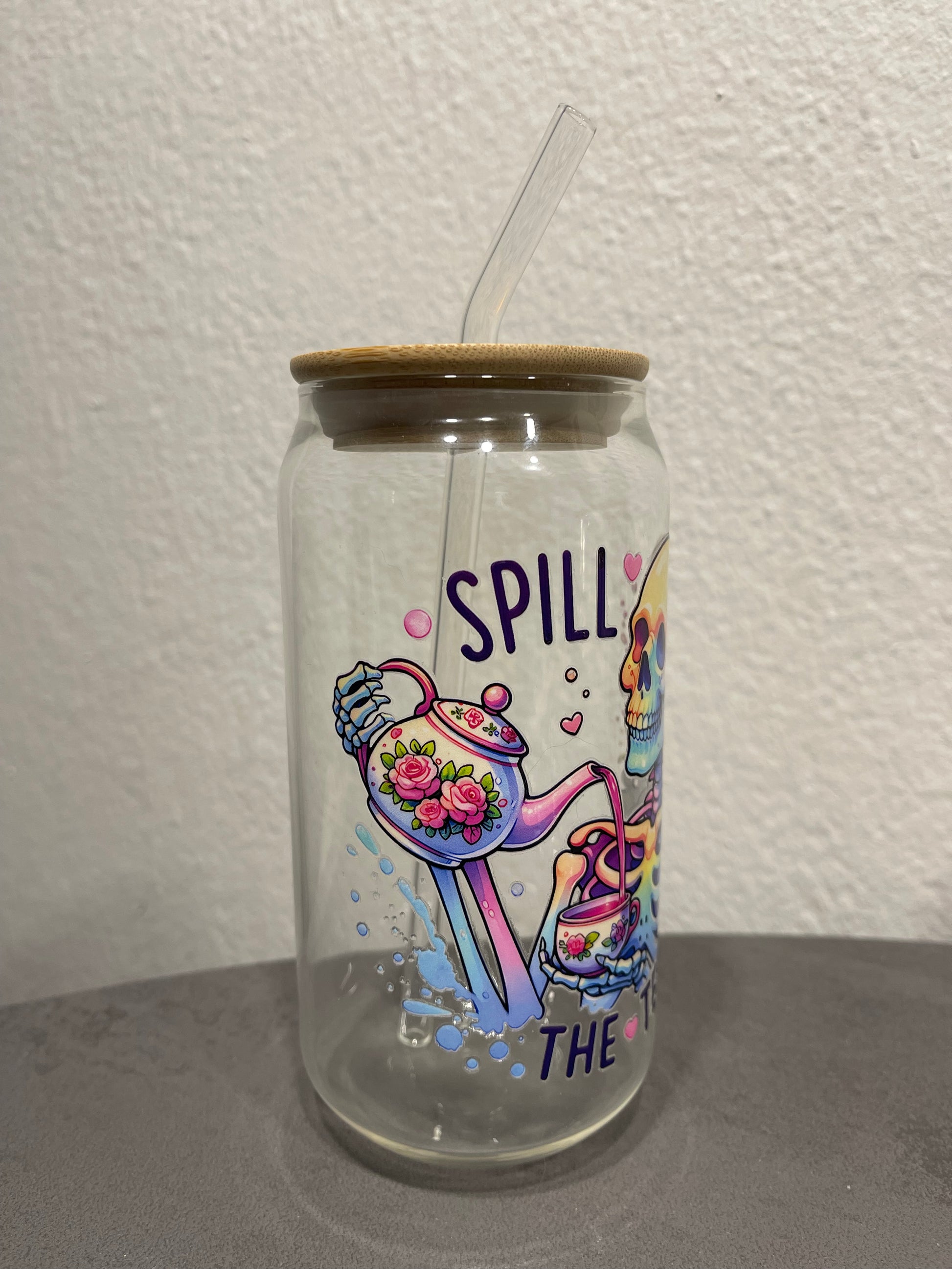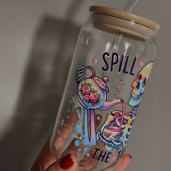 „Spill The Tea Skull“ Trinkbecher mit Deckel & Strohhalm aus Glas